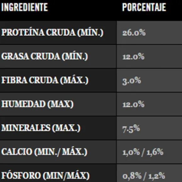 Carne De Pollo, Gluten De Maíz, Harina De Subproductos De Pollo, Arroz, Maíz Amarillo, Grasa Animal (Res Y/O Pollo Y/O Cerdo) Preservada Con Tocoferoles Mezclados (Fuente De Vitamina E), Trigo, Digesto Animal (Hidrolizado De Subproductos De Cerdo Y/O Pollo), Salvado De Maíz, Ortofosfato De Calcio, Levadura Seca De Cervecería Inactiva Con Selenio (Fuente De Beta-Glucanos Y Selenio), Huevo En Polvo, Aceite De Pescado, Spirulina En Polvo, L-Lisina, Cloruro De Potasio, Sal, Carbonato De Calcio, Cloruro De Colina, Taurina, Dl-Metionina, Ácido Ascórbico (Fuente De Vitamina C), Sulfato De Zinc, Proteinato De Zinc, Sulfato Ferroso, Suplementos Vitamínicos (A, D-3, E, B-12), Suplemento De Riboflavina, Niacina, Pantotenato De Calcio, Sulfato De Manganeso, Proteinato De Manganeso, Mononitrato De Tiamina, Ácido Fólico, Sulfato De Cobre, Proteinato De Cobre, Hidrocloruro De Piridoxina, Iodato De Calcio, Selenito De Sodio..