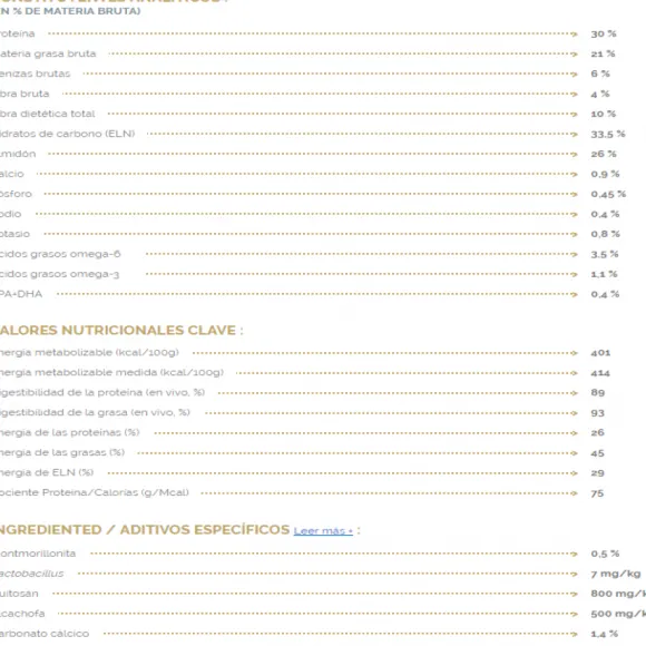 Proteínas De Cerdo Y De Aves Deshidratadas*, Arroz, Grasa Animal, Guisantes Enteros, Almidón De Patata, Proteínas De Patata*, Sales Minerales, Proteínas De Cerdo Y De Aves Hidrolizadas*, Lignocelulosa, Pulpa De Remolacha, Linaza, Aceite De Pescado, Fructooligosacáridos, Quitosán, Extracto De Hojas De Alcachofa Deshidratado, Lactobacillus Acidophilus Pasteurizados.