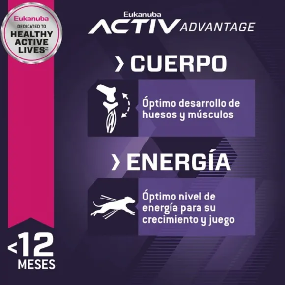 Eukanuba Puppy Large Cubre Las Necesidades De Todos Los Perros Cachorros De Raza Grande, Contiene Unos Niveles Adaptados De Energía, Calcio Y Fósforo Que Favorece El Buen Desarrollo De Las Articulaciones Y Los Huesos. Gracias Al Calcio, Que Fortalece Los Huesos, Su Cachorro Crecerá Preparado Para Descubrir El Mundo Y Enfrentarse A Cualquier Desafío. El Pollo Es Nuestra Fuente Principal De Proteína Para Que Los Cachorros, Como Buenos Carnívoros Que Son, Tengan Un Ingrediente Natural Para Que Sus Músculos Crezcan Fuertes Y Compactos. Los Cachorros De Raza Grande Son Muy Activos Y Siempre Andan En Busca De Aventuras, Por Lo Que Esta Comida Superior Para Perro Fortalece Sus Defensas Con Antioxidantes De Primera Calidad. El Conocimiento Y El Respeto De Eukanuba Por Las Necesidades Nutricionales De Las Diferentes Razas Ha Dado Lugar A Asociaciones Con Criadores Y Sus Organizaciones De Referencia. Somos “Socios De Excelencia” Con Muchas Federaciones Caninas Europeas, Entre Las Que Se Incluye «The Kennel Club». Además Estamos Colaborando Con Varias Organizaciones Caninas De Gran Reconocimiento Y Confianza, Como La Federation Cynologique Internationale. Las Ventajas De Este Productos Son: