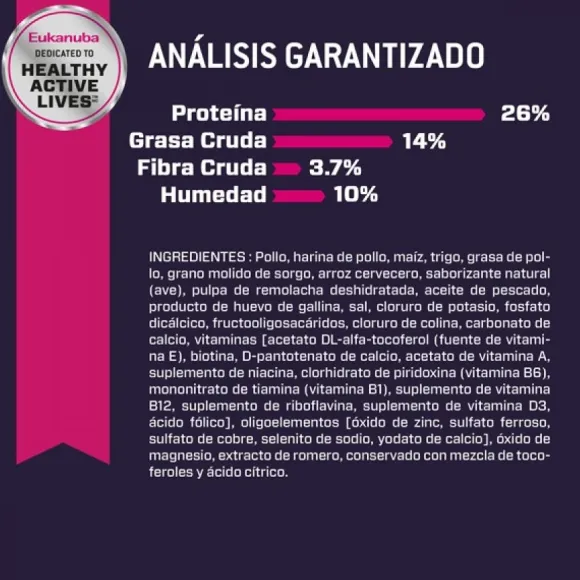 Pollo, Harina De MaíZ, Harina De Subproductos De Pollo (Fuente Natural De Sulfato De Condroitina Y Glucosamina), Sorgo Integral Molido, Arroz De CerveceríA, Pulpa De Remolacha Seca, Sabor A Pollo, Producto De Huevo Seco, Aceite De Pescado (Preservado Con Una Mezcla De Tocoferoles, Fuente De Vitamina E), Levadura De Cerveza Seca, Harina De Pescado, Cloruro De Potasio, Grasa De Pollo (Preservada Con Una Mezcla De Tocoferoles, Fuente De Vitamina E), Sal, Carbonato De Calcio, Cloruro De Colina, FructooligosacáRidos, Minerales (Sulfato Ferroso, ÓXido De Zinc, Sulfato De Manganeso, Sulfato De Cobre, ÓXido Manganoso, Yoduro De Potasio, Carbonato De Cobalto), Dl-‐Metionina, Vitaminas (ÁCido AscóRbico, Acetato De Vitamina A, Pantotenato De Calcio, Biotina, Mononitrato De Tiamina (Fuente De Vitamina B1), Suplemento De Vitamina B12, Niacina, Suplemento De Riboflavina (Fuente De Vitamina B2), Inositol, Hidrocloruro De Piridoxina (Fuente De Vitamina B6), Suplemento De Vitamina D3, ÁCido FóLico), Suplemento De Vitamina E, CaléNdula,Beta-‐Caroteno, Extracto De Romero.