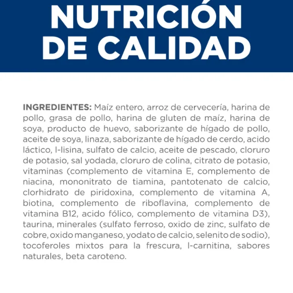 Maíz, Pollo (26%) Y Harina De Pavo, Trigo, Grasa Animal, Digest, Harina De Gluten De Maíz, Semilla De Lino, Minerales, Aceite De Soja, Harina De Salvado De Guisante, Aceite De Pescado, Vitaminas, Taurina, Elementos Traza Y Beta-Carotenos. Con Antioxidante Natural (Mezcla De Tocoferoles).