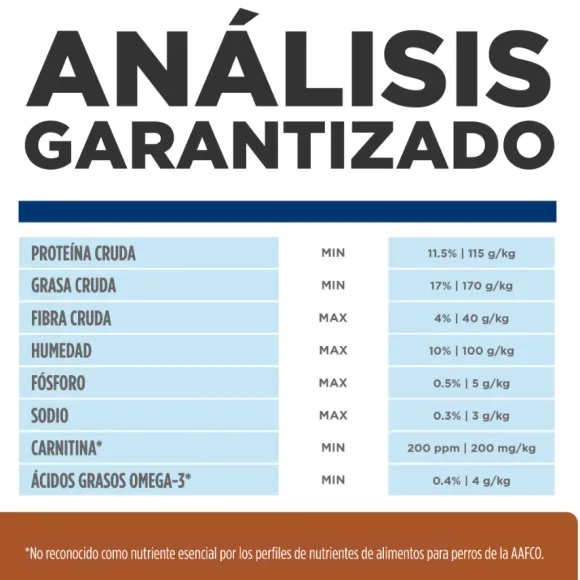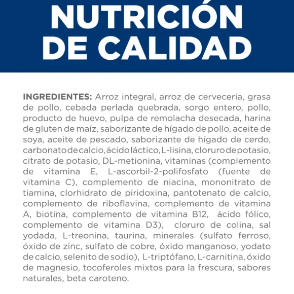 Arroz Integral, Arroz De Cerveza, Grasa De Cerdo, Cebada Perlada Agrietada, Pollo, Huevo, Pulpa De Remolacha Seca, Sorgo Integral, Harina De Gluten De Maíz, Sabor A Hígado De Pollo, Aceite De Soja, Aceite De Pescado, Carbonato De Calcio, Ácido Láctico, L-Lisina, Sabor A Hígado De Cerdo, Cloruro De Potasio, Citrato De Potasio, Dl-Metionina, Vitaminas (Suplemento De Vitamina E, L-Ascorbil-2-Polifosfato (Fuente De Vitamina C), Suplemento De Niacina, Mononitrato De Tiamina, Clorhidrato De Piridoxina, Pantotenato De Calcio, Suplemento De Riboflavina, Vitamina Un Suplemento, Suplemento De Vitamina B12, Biotina, Ácido Fólico, Suplemento De Vitamina D3), L-Treonina, Cloruro De Colina, Sal Yodada, Taurina, Óxido De Magnesio, Minerales (Sulfato Ferroso, Óxido De Zinc, Sulfato De Cobre, Óxido Manganoso, Yodato De Calcio, Sodio Selenita), L-Carnitina, L-Triptófano, Mezcla De Tocoferoles Para La Frescura, Sabores Naturales, Betacaroteno.