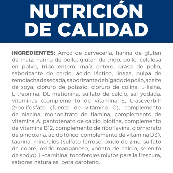 Brewers Rice, Corn Gluten Meal, Chicken Meal, Wheat Gluten, Powdered Cellulose, Chicken, Whole Grain Corn, Whole Grain Wheat, Pork Flavor, Pork Fat, Lactic Acid, Chicken Liver Flavor, Potassium Chloride, Choline Chloride, Soybean Oil, L-Lysine, Iodized Salt, Calcium Sulfate, Dl-Methionine, L-Threonine, Vitamins (Vitamin E Supplement, L-Ascorbyl-2-Polyphosphate (Source Of Vitamin C), Niacin Supplement, Thiamine Mononitrate, Vitamin A Supplement, Calcium Pantothenate, Riboflavin Supplement, Biotin, Vitamin B12 Supplement, Pyridoxine Hydrochloride, Folic Acid, Vitamin D3 Supplement), Taurine, Minerals (Ferrous Sulfate, Zinc Oxide, Copper Sulfate, Manganous Oxide, Calcium Iodate, Sodium Selenite), L-Carnitine, Mixed Tocopherols For Freshness, Natural Flavors, Beta-Carotene