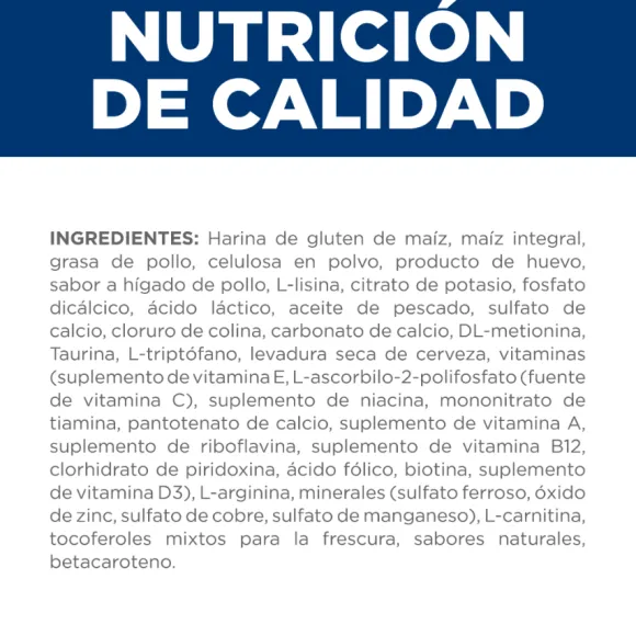 Corn Gluten Meal, Pork Fat, Whole Grain Corn, Soybean Mill Run, Egg Product, Chicken Liver Flavor, L-Lysine, Potassium Citrate, Lactic Acid, Dicalcium Phosphate, Fish Oil, Choline Chloride, Calcium Carbonate, Calcium Sulfate, Dl-Methionine, Taurine, L-Tryptophan, Brewers Dried Yeast, Vitamins (Vitamin E Supplement, L-Ascorbyl-2-Polyphosphate (Source Of Vitamin C), Niacin Supplement, Thiamine Mononitrate, Calcium Pantothenate, Vitamin A Supplement, Riboflavin Supplement, Vitamin B12 Supplement, Pyridoxine Hydrochloride, Folic Acid, Biotin, Vitamin D3 Supplement), Minerals (Ferrous Sulfate, Zinc Oxide, Copper Sulfate, Manganese Sulfate), L-Carnitine, Mixed Tocopherols For Freshness, Natural Flavors, Beta-Carotene