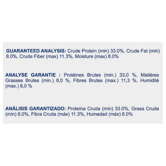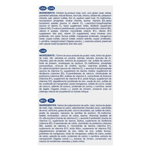 Harina De Pollo, Cascarilla De Arroz, Gluten De Trigo, Maíz, Gluten De Maíz, Trigo, Cerveza, Sabores Naturales, Grasa De Pollo, Pulpa Seca De Remolacha, Destiladores De Grano, Levadura Seca, Aceite De Pescado, Sal, Sulfato De Calcio, Cloruro De Potasio, Cáscara De Semilla De Psyllium , Aceite Vegetal, Cloruro De Colina, Vitaminas [Acetato De Tocoferol Dl-Alfa (Fuente De Vitamina E), L-Ascorbil-2-Polifosfato (Fuente De Vitamina C), Suplemento De Niacina, Biotina, Suplemento De Riboflavina, Pantotenato De D-Calcio, Clorhidrato De Piridoxina (Vitamina B6), Acetato De Vitamina A, Mononitrato De Tiamina (Vitamina B1), Suplemento De Vitamina B12, Ácido Fólico, Suplemento De Vitamina D3], Pirofosfato De Sodio, Taurina, Minerales Traza [Proteinato De Zinc, Óxido De Zinc, Sulfato Ferroso, Proteinato De Manganeso, Óxido De Mangano , Sulfato De Cobre, Yodato De Calcio, Selenito De Sodio, Proteinato De Cobre], Carbonato De Calcio, L-Carnitina,Extracto De Romero, Conservado Con Tocoferoles Mixtos Y Ácido Cítrico