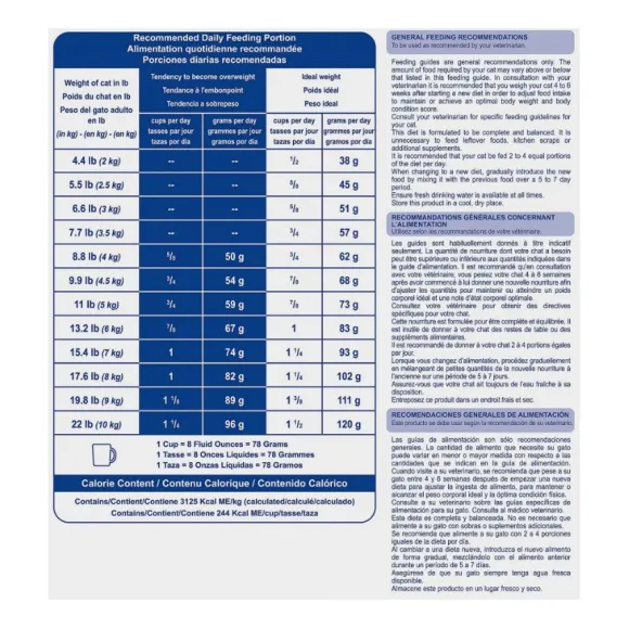 - Control De Peso Una Igual Que Los Humanos, Hay Gatos Glotones, Ansiosos Con La Comida, O Que Han Sido Esterilizados Pudiendo Ganar Peso De Manera Más Rápida Que Otros Sin Esterilizar. Por Eso Esta Fórmula Ayuda A Controlar El Peso Al Minimizar La Acumulación De Grasa A Través De Un Alto Contenido De Proteína, Menos Calorías Y La Adición De L-Carnitina Que Ayuda A Quemar Las Reservas De Grasa En Exceso A La Vez Que Ayuda A Mantener A Su Felino Más Saceado Por Más Tiempo.