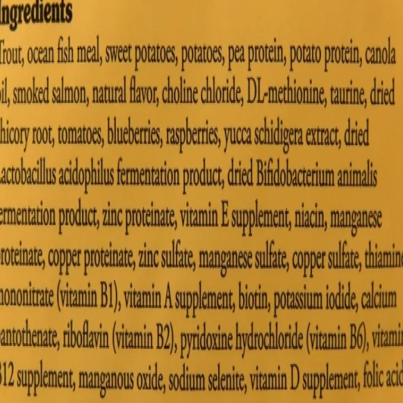 Trucha, Harina De Pescado Del Océano, Camotes, Papas, Arvejas, Proteína De Papa, Aceite De Canola, Salmón Ahumado, Sabor Natural, Cloruro De Colina, Dl-Metionina, Taurina, Raíz De Achicoria Seca, Tomates, Arándanos, Frambuesas, Extracto De Yuca Semidigera, Secado Producto De Fermentación De Lactobacillus Acidophilus, Producto De Fermentación De Bifidobacterium Animalis, Proteinato De Zinc, Suplemento De Vitamina E, Niacina, Proteinato De Manganeso, Proteinato De Cobre, Sulfato De Zinc, Sulfato De Manganeso, Sulfato De Cobre, Mononitrato De Tiamina (Vitamina B1), Suplemento De Vitamina A, Biotina, Yoduro De Potasio , Pantotenato De Calcio, Riboflavina (Vitamina B2), Clorhidrato De Piridoxina (Vitamina B6), Suplemento De Vitamina B12, Óxido Manganoso, Selenito De Sodio, Suplemento De Vitamina D, Ácido Fólico.