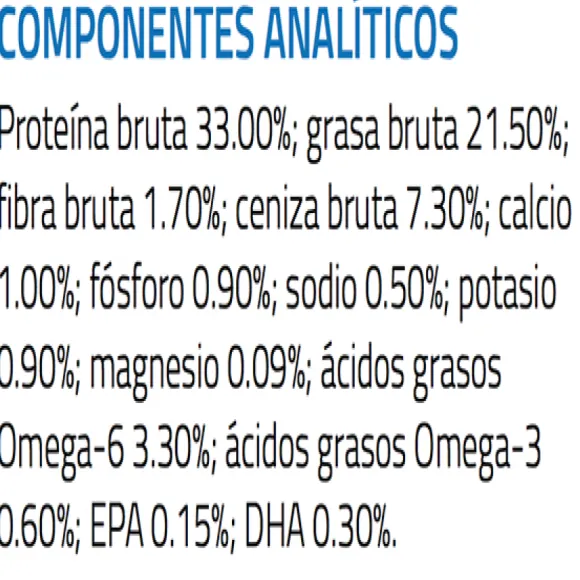 Carne De Pollo Deshidratada, Arroz, Grasa Animal, Gluten De Maíz, Espelta, Semillas De Lino, Hidrolizado De Proteínas De Origen Animal, Pescado Seco, Pulpa De Remolacha Deshidratada, Aceite De Pescado, Huevo Entero Deshidratado, Fibra Vegetal De Guisantes, Aceite Vegetal, Semillas De Psyllium, Cloruro De Potasio, Levadura De Cerveza Seca, Inulina (0.6%), Fructooligosacáridos (0.6%), Mananooligosacáridos (0.6%), Cloruro De Potasio, Cloruro De Sodio, Fosfato Monosódico, Sulfato De Calcio Dihidratado, Extracto De Flor De Caléndula (Fuente De Luteína). Fuentes De Sustancias Mucilaginosas: Semillas De Psyllium.