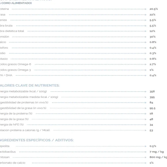 Proteína Deshidratada De Arroz, Cerdo Y Aves De Corral *, Grasas Animales , Guisantes *, Fécula De Patata, Cáscaras De Frijoles, Sales Minerales, Lignocelulosa, Proteína Hidrolizada De Linaza, Cerdo Y Ave *, Pulpa De Remolacha, Aceite De Pescado, Fructooligosacáridos, Quitosano, Lactobacillus Pasteurizado Acidophilus..